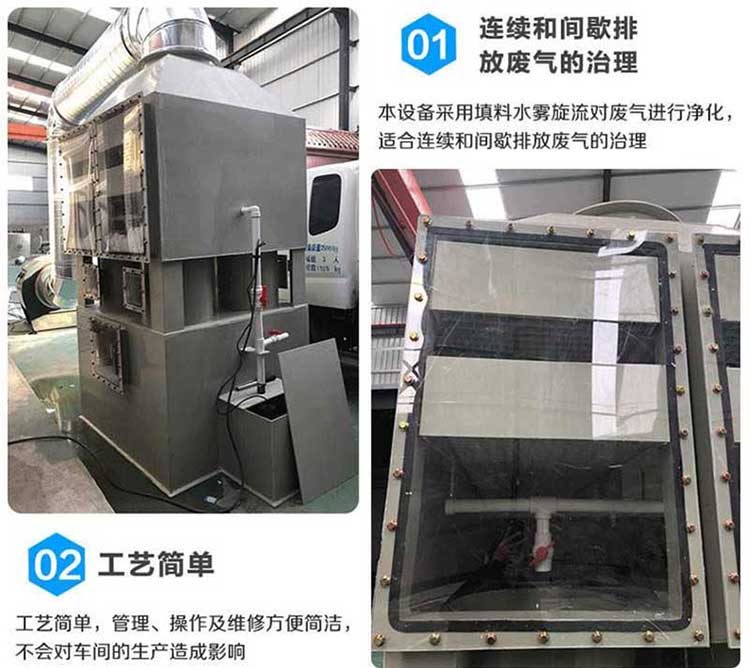 需要處理的含塵廢氣由風管引入凈化塔,經過旋流塔洗滌桶時,風帶加快,帶動填料球飛快運轉。在洗滌桶里,含塵廢氣與水霧充分混合洗滌,中和反應(水里補充有酸堿時)廢氣經過凈化后,再清除霧層脫水除霧后由風機排入大氣或再進入其他凈化設備(光氧催化、低溫等離子等)。吸收液在塔底輕水泵增壓后在箱頂噴淋霧化而下,***后回流直箱底循環使用,凈化的廢氣達到國家排放標準