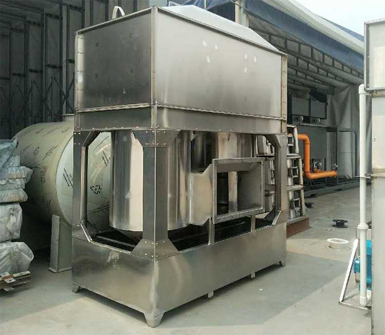 2、旋流板除塵塔內安裝有多個“圓形旋流桶”和高效除霧板。旋流桶內放有實心填料球,用來凈化粉塵或粘性廢氣,***上層的除霧板用來凈化水霧,達到去除水霧的目的,經引風機引入的廢氣在塔內旋流上升、并在各板上與由塔頂進入的液體旋流接觸,完成除塵、脫硫任務。旋流板塔在離心力的作用下,煙氣中的顆粒物沉入水池, ***后由人工撈出清理,同時塔內的水可以繼續循環使用,不會造成污染。經過凈化的廢氣,再經過后繼凈化設備處理,使之達到國家排放標準。