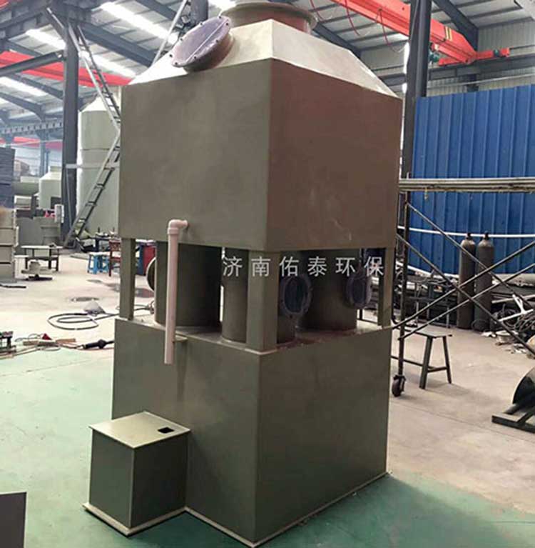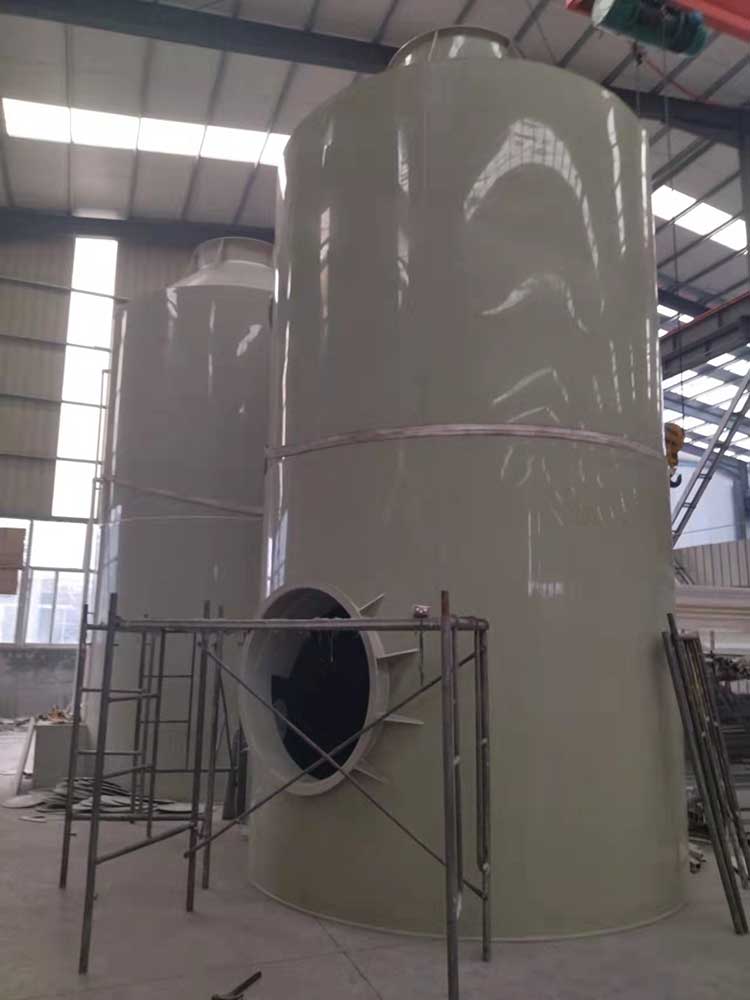 1.5萬(wàn)風(fēng)量pp噴淋塔塔規(guī)格為:ф1.8m*H4.0m*10mm。進(jìn)、出風(fēng)口直徑均為600mm。循環(huán)水量每小時(shí)22立方。每小時(shí)處理廢氣量15000立方左右。凈化塔整體厚度為8mm PP板。塔體內(nèi)部有二層水噴淋裝置,三層浮球填充,帶水箱和2.2KW純銅芯普通循環(huán)水泵。
