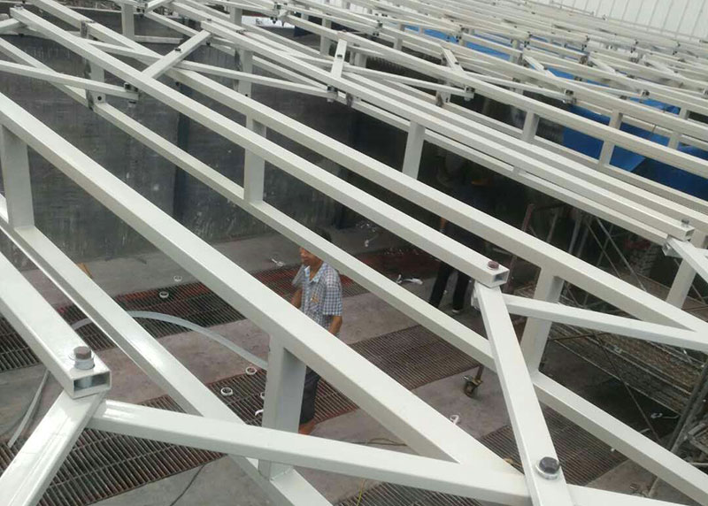三、頂部伸縮噴漆房是移動伸縮噴漆房的一種,伸縮頂蓬兩端有固定的支撐,伸縮裝置在固定支撐上面伸縮移動,方便工件運轉。以下為您展示安裝圖片。