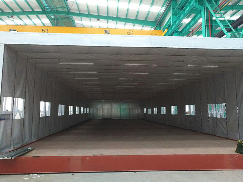 ***種是移動(dòng)伸縮式噴漆房,伸縮房一端固定,固定端可配置粉塵收集回收設(shè)備或者漆霧收集處理設(shè)備,另一端伸縮,方便工件來(lái)回運(yùn)轉(zhuǎn)。工件準(zhǔn)備時(shí),伸縮房收縮;工件到達(dá)伸縮房?jī)?nèi)***區(qū)域,伸縮房伸展;噴漆工作完成后,收縮房體,工件移出。此種伸縮房是現(xiàn)在使用***多的伸縮房,其長(zhǎng)寬高根據(jù)企業(yè)的實(shí)際情況定制。