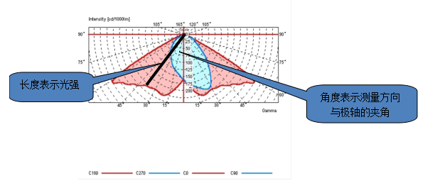 這種方法通常用于描述室內(nèi)和道路的燈具的光分布。它很形象地以極坐標(biāo)的原點表示燈具的光中心,以一定方向的矢量表示光強的大小,以極坐標(biāo)的角度表示光強矢量與光軸之間的夾。