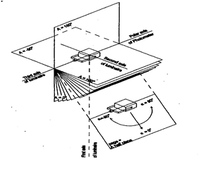A-平面坐標(biāo)系統(tǒng)的說明如圖。極軸在豎直方向。豎直半平面內(nèi)的角度數(shù)據(jù)叫做α角度,到此平面的垂直角度是A角度。使用(A, α)坐標(biāo)指示球面上的某點。α 0 ° 在赤道圈上。燈具口面通常瞄準(zhǔn)點(0,0),并且α 0 °平面垂直于燈具口面。α角度的范圍是從-90 °至90 °。A角度范圍從-180 °到180 °,-90 °將在最低點,90 °在最高點。汽車車燈光度數(shù)據(jù)通常使用A-平面坐標(biāo)系統(tǒng)。