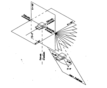 B-平面坐標(biāo)系統(tǒng)的說明如圖。極軸在水平方向。水平半平面內(nèi)的角度數(shù)據(jù)叫做H角度,到此平面的垂直角度是V角度。使用(H,V)坐標(biāo)指示球面上的某點。H 0 °在赤道圈上。燈具口面通常瞄準(zhǔn)點(0,0),并且V 0 °平面垂直于燈具口面。H角度的范圍是從-90 °至90 °。V角度范圍從-180 °到180 °,-90 °將在最低點,90 °在最高點。泛光燈光度數(shù)據(jù)通常使用B-平面坐標(biāo)系統(tǒng)。