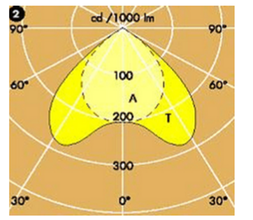 這是我們最為常見的極坐標配光曲線圖。注意注釋:T = C0°-180° A = C90°-270°;C表示水平面的角度(立體角是由水平和垂直2個角度組成),0°-180°組成了一個剖面。T表示光在C0°-180°剖面上(垂直于燈管方向)的分布情況。同理A表示光在C90°-270°剖面上的分布情況。