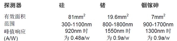 例如美國藍(lán)菲光學(xué)公司(Labsphere)的一款激光功率計(LFPMS)采用了硅型二極管探測器。 它的波長響應(yīng)范圍在300-1100nm處,其中峰值響應(yīng)在920nm時到達(dá)0.48A/W。下圖2是LFMPS光電二極管探測器的性能參數(shù)。