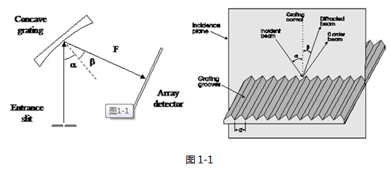 其中Βeta是衍射角,d是槽周期(這是等于槽密度的倒數(shù)),m為衍射級(jí),λ是光的波長(zhǎng),如圖1-1。