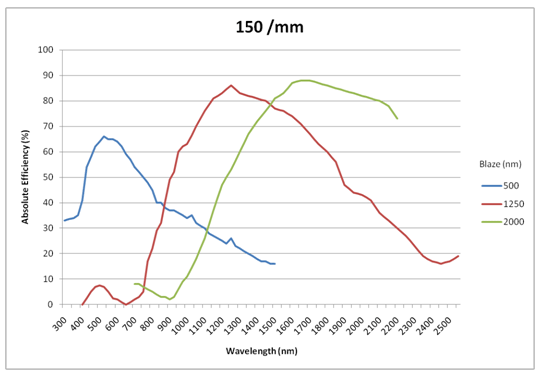 光柵可焊到在特定波長(zhǎng)提供高的衍射效率(> 85%),即一個(gè)閃耀波長(zhǎng)(λB)。 作為一個(gè)經(jīng)驗(yàn)法則,光柵效率將通過在0.6×λB 50%和1.8×λ 乙降低。 此設(shè)置在光譜儀的光譜覆蓋范圍的限制。因此,通常衍射的閃耀波長(zhǎng)光柵偏向的光譜范圍弱側(cè)提高整體信號(hào)給分光計(jì)的信噪比(SNR)。