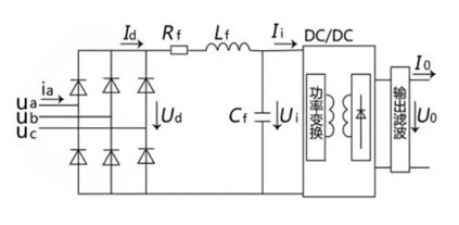 直流充電樁電氣系統三相電網輸入交流電,經過三相橋式不可控整流電路整流變成直流電,濾波后提供給高頻DC-DC功率變換器,功率變換器經過直直變換輸出需要的直流,再次濾波后為電動汽車動力電池充電。如圖3所示。