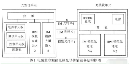 EMC測試低頻光導傳輸儀器設備由光發送單元和光接收單元組成。光發送單元由背板、控制板(包括電源單元、測試信號發生器單元及控制電路單元)、1OMHz通道發送板(2通道)以及1MHz通道發送板(6通道)組成;光接收單元由背板(包括電源單元、IEEE488接口單元)、10MHz通道接收板(2通道)以及1MHz通道接收板(6通道)組成。如圖1所示。
