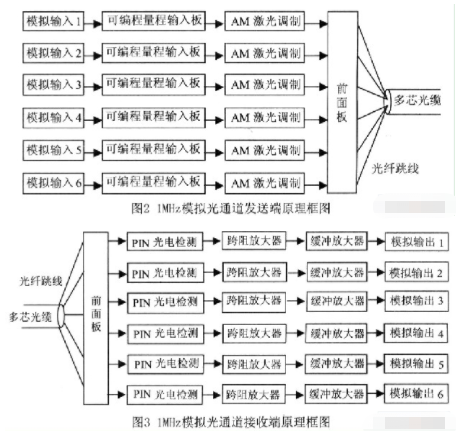 EMC測試低頻光導傳輸儀器設備1MHz模擬光通道包含6個低頻模擬信號光傳輸通道,6個低頻傳輸通道的信號頻帶為100Hz~1MHz,采用1550nm單縱模DFB激光器和AM直接強度調制技術,通過6芯單模光纖傳輸,原理框圖如圖2、圖3所示。