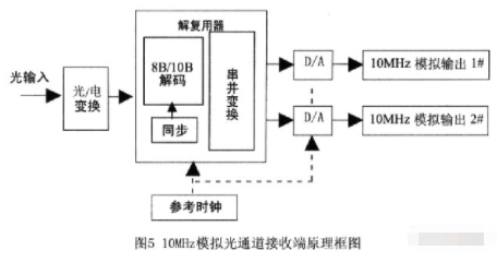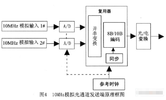 2路10MHz模擬光傳輸通道的信號頻帶為DC~10MHz,采用模數一數模的全數字調制方式,在單芯單模光纖中以131Onm波長激光傳輸。發送時對2個模擬傳輸通道高速采樣,進行A/D轉換,通過光電轉換電路,再復用到一根光纖上傳輸;反之,接收時,首先對從光纖上來的高速數字信號解復用成數字信號,進行D/A轉換,轉變成模擬信號。