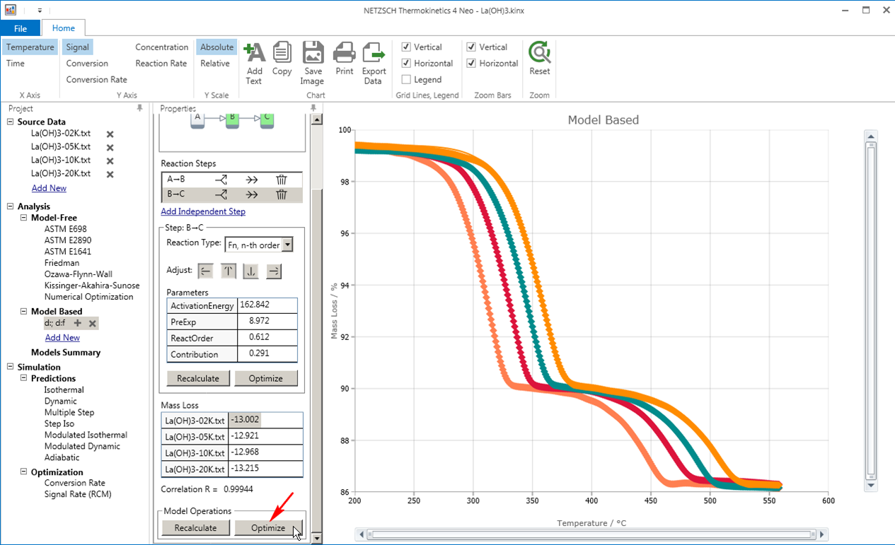 NETZSCHKineticsNeo是耐馳公司繼經典的ThermoKinetics3.1之后,重新設計方案、全新推出的新的動力學軟件。軟件著重分析反應速率與溫度的相關性,故又稱為熱動力學(Thermokinetics)。分析最終可給出動力學模型(或可在不同的溫度條件下正確描述實驗數據的方法)。基于動力學模型,可在用戶定義的溫度條件下,對反應體系的行為進行預測,或應用于工藝條件的優化。