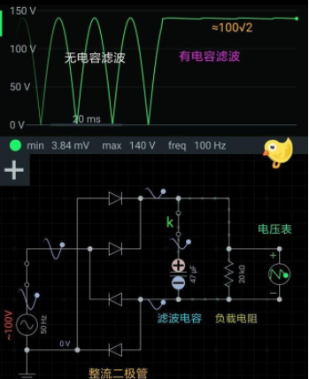 此時,使用數字萬用表的DC電壓文件,測得的負載電阻兩端的電壓既不是141.4V,也不是100V,可是此波形一個周期的平均值是100×2√。2/π≈90V。僅當開關k閉合且連接47uF濾波電容器時,負載電阻兩端才能獲得紋波較小的直流電壓,如右圖所示。此時,電壓值幾乎等于正弦交流電壓的最大值(峰值),即100x1.414=141.4V,這在用數字萬用表測量時非常接近該值。
