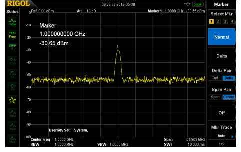 一定要注意,上面的標記顯示的是1GHz處的峰值,幅度為-10dBm。現階段,我們將一個1.5GHz無源探頭(RigolRP6150無源探頭)連接到頻譜分析儀的輸入。當連接到50歐姆時,RP6150被設計為10:1探頭。
