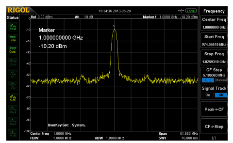 我們將使用無源1.5GHz示波器探頭,使用RF信號源將1GHz的-10dBm信號(正弦波)發送到頻譜分析儀。
