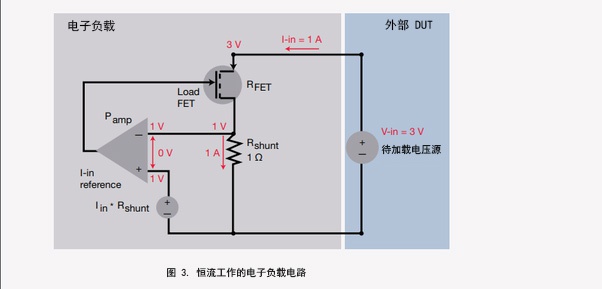 電流放大器將分流器上的壓降與參考編程值進行比較(例如1A*1Ω=1V)。放大器輸出信號調節FET電阻和電子負載的輸入電流。這類反饋配置允許負載動態地改變電阻并保持編程電流,而不受電源設備電壓變化的影響。負載可以吸收所需電流的最小電壓受輸入電流水平和FET的低電壓行為特性的限制。