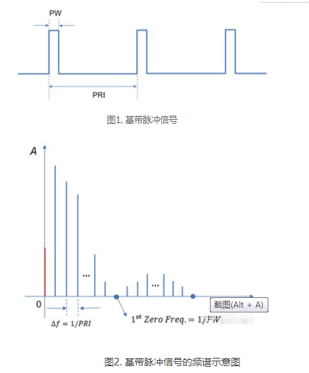 這就需要了解基帶脈沖信號的頻譜了,假設圖1所示基帶脈沖的脈寬為PW,周期為PRI,則相鄰譜線間距為1/PRI。為方便起見,圖2所示的頻譜示意圖只包含了主瓣和一旁瓣,理論上講,脈沖的頻譜包含無數多個旁瓣,只是越遠離主瓣,旁瓣的幅度越小。