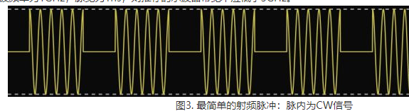 2.射頻脈沖的測試:與基帶脈沖不同,射頻調制脈沖是指在脈內引入了載波,圖3給出了最簡單的射頻脈沖。從本質上講,這種射頻脈沖生成的過程就是基帶脈沖對載波調幅的過程,因此射頻脈沖的頻譜與基帶脈沖頻譜基本相同,只是前者將頻率搬移至載波[公式]處,如圖4所示。