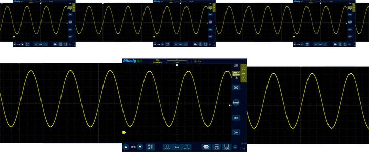 如果每次顯示的波形都不一樣,并且屏幕每次出現(xiàn)過的波形都不消失,那么我們看數(shù)字示波器的波形就會(huì)疊加變成這樣。可是如果每次顯示的波形都基本上一樣,即使屏幕每次出現(xiàn)過的波形都不消失,我們看數(shù)字示波器的波形依然是穩(wěn)定的正弦波。