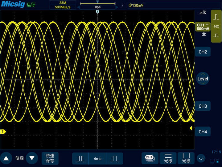 數(shù)字示波器的時(shí)基是4ms,代表屏幕橫坐標(biāo)上波形走過一格是4ms的時(shí)間,數(shù)字示波器橫坐標(biāo)一共有14格,那么一屏幕就是56ms的波形。