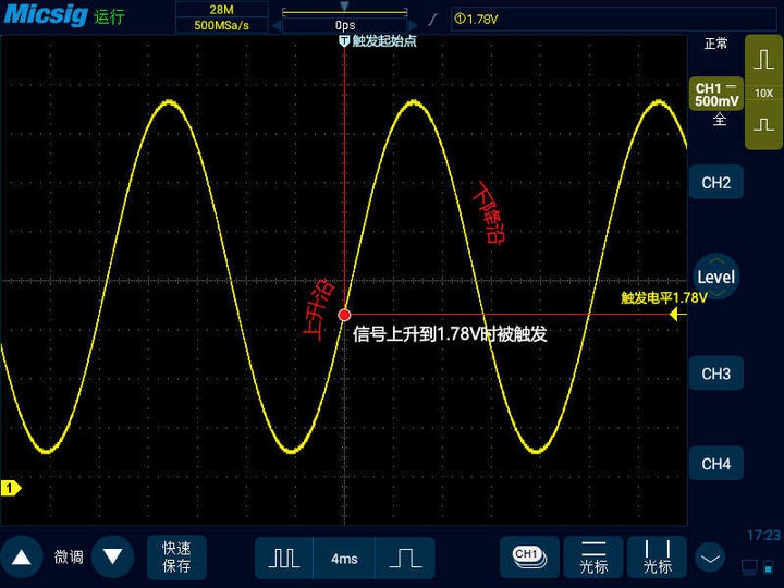想要波形每次都一樣,那么就是要找到波形重復(fù)的規(guī)律,我們繼續(xù)觀察這個(gè)正弦波,這是一個(gè)周期性變化的正弦波,它的每個(gè)周期都有一個(gè)上升沿和下降沿,如果我們讓數(shù)字示波器每次都從上升沿開始捕捉那就可以重復(fù)了嗎?