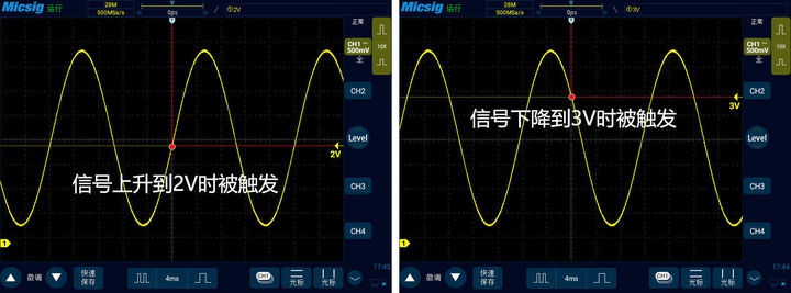 上述所說這種尋找重復(fù)波形的思路是數(shù)字示波器中最常見的也是最常用的觸發(fā)思路,叫做邊沿觸發(fā)。通過調(diào)節(jié)上升邊沿或者下降邊沿,來定義數(shù)字示波器觸發(fā)起始點(diǎn)捕獲的是上升中的波形還是下降中的波形。