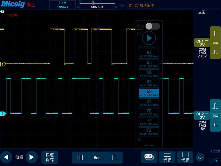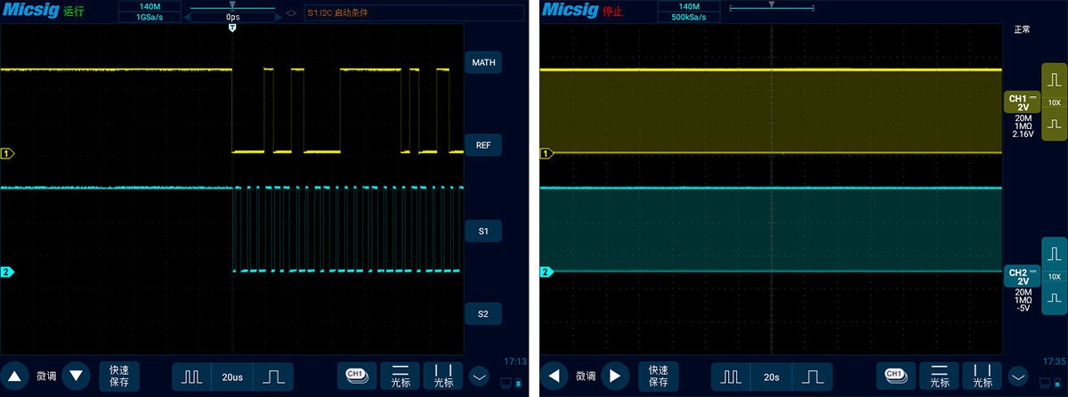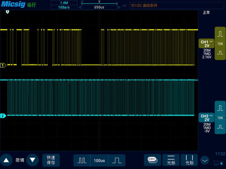比如說下圖是一個I2C總線信號,圖左邊時基是20us,圖右邊時基是20s。可以看到圖左邊是正常的脈沖信號,此時的采樣率是1GSa/s。圖右邊考慮到波形記錄時長增加,采樣率下降到了500KSa/s。