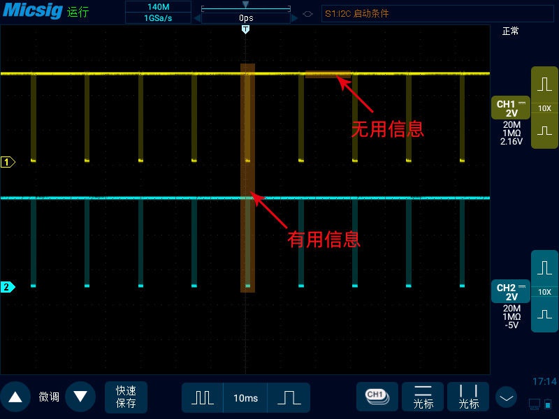 我們將數字示波器的時基打到10ms,可以看到我們采集到的I2C總線信號有很大一部分時間采集的其實都是無用信息。我們真正需要看的信號只是整個周期的一小段。并且無用信息和有用信息之間的周期都是大致一致的。