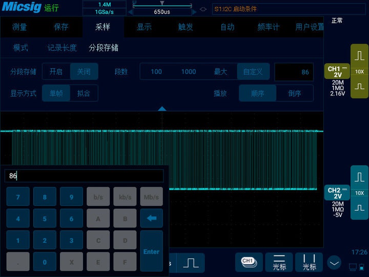 接下來,我們打開示波器將記錄長度設為合適值,然后打開分段存儲設置,設置要存儲的段數,比如說下圖設置成了86段,代表示波器會記錄86段上圖那樣的有用信息,點擊開啟分段存儲。