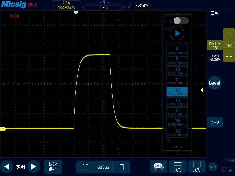 比如說我們要捕獲30個異常情況脈沖,首先我們把示波器的觸發模式改為正常,調節好觸發方式(類似單次觸發的操作),當異常情況信號沒有到來的時候示波器處于等待狀態,可以看到采集到的信號個數是0/30。