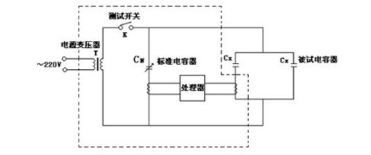 該電容電橋測試儀采用橋式電路結構,標準電容器和被試電容器作為橋式電路的兩臂。當進行電容器電容值測量時,測試電壓同時施加在標準電容器和被試電容器上,處理器通過傳感器同采集流過兩者的電流信號并進行處理后得也被試電容器的電容值。