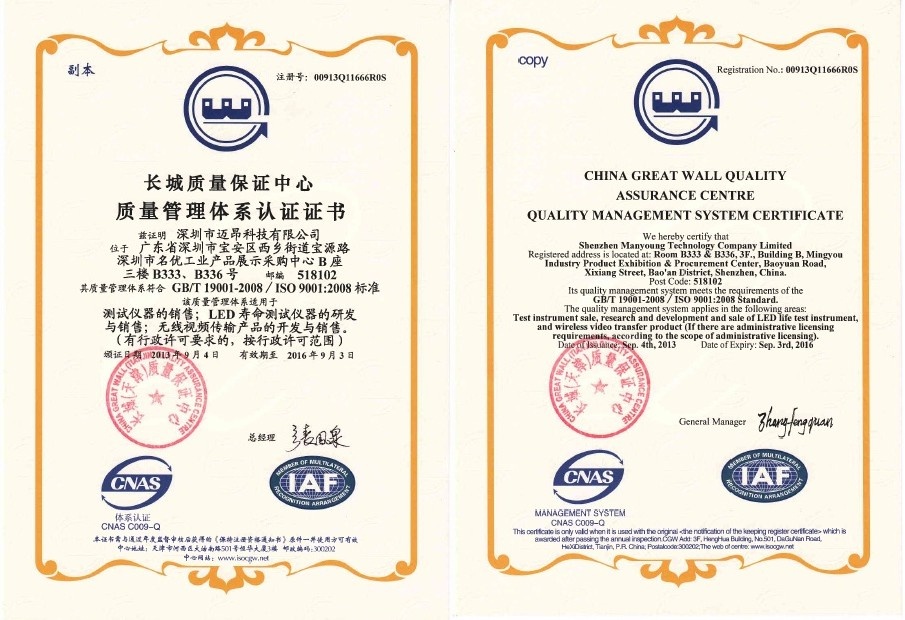 經過公司全體同事的通力合作,邁昂科技已經順利通過權威ISO認證機構的嚴格審核,于2013年9月4日正式獲得ISO9001:2008質量管理體系認證證書。