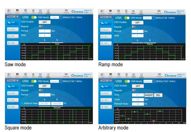 為滿足電競影像快速變化需求,其幀率 (Frame rate) 會隨時變化,孕育而生VRR (Variable Refresh Rate,又稱Gaming-VRR) 可變刷新率技術,可配合游戲幀率即時調整刷新率,進而減少斷續延遲與畫面撕裂現象,使影像畫面顯得更為平順。A223814配備4種VRR檢測模式分別為:Saw、Ramp、Square和Arbitrary,可讓使用者在20Hz ~ 480Hz之間任意地調整刷新率,模擬玩游戲時顯示器可能出現的不同更新率;其中在Arbitrary模式下,用戶可以任意設定檢測所需的幀率與維持期間的參數組合。