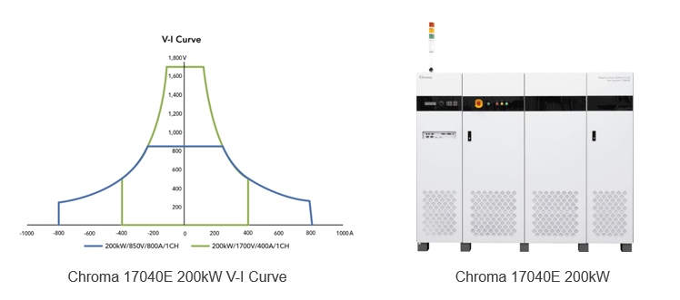 Chroma 17040E能源回收式電池測試系統是高壓電池包測試利器之一,單臺200kW輸出,并聯3臺功率600kW,用于模擬大功率充電樁,具備兩段電壓、電流操作區間,電壓最高可達1,700V,在1,700V檔位最大電流可操作達400A,在850V電壓檔位輸出可操作至800A,符合現有乘用車與未來高壓電池包測試應用,兼顧高電壓與大電流測試需求,適合用于電動車續航力試驗、產品進出貨檢驗、設計驗證研究…等用途,結合電池廠生產線的電池包下線測試系統(EOL-End Of Line ATS),縮短電池包生產時間(cycle time),符合電池包生產的測試要求并提升產能。