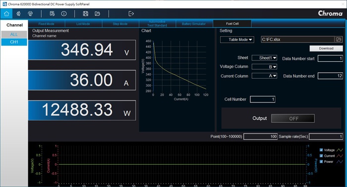 Chroma 62180D-1200直流電源作為燃料電池仿真器時(shí)可提供最多30臺(tái)并聯(lián)操作,輸出功率達(dá)540KW,輸出電流為1200A,滿足目前實(shí)際燃料電池發(fā)動(dòng)機(jī)總成,并具有能源回收的功能;搭配圖形化操作軟件SoftPanel,進(jìn)行真實(shí)燃料電池特性曲線仿真功能。用戶可自行匯入完整電堆的電流對(duì)應(yīng)電壓曲線I-V curve數(shù)據(jù)數(shù)據(jù),便可進(jìn)行特性模擬的測(cè)試。或者直接選擇內(nèi)建Fuel Cell特性數(shù)據(jù),搭配Cell Number設(shè)定 (串聯(lián)概念,主要是提升電壓),以及Area的設(shè)定(并聯(lián)概念,主要是提升電流) ,同樣地也可以合成方式產(chǎn)出特性曲線數(shù)據(jù)。此外由于Chroma燃料電池仿真器具備毫秒級(jí)的快速響應(yīng),適合在實(shí)驗(yàn)室進(jìn)行直流電源轉(zhuǎn)換器的動(dòng)態(tài)響應(yīng)及穩(wěn)定度,當(dāng)然也適用于長時(shí)間耐久性驗(yàn)證及系統(tǒng)功能性確認(rèn)。如下圖采用30臺(tái)跨柜并聯(lián)實(shí)例,實(shí)現(xiàn)大功率燃料電池仿真器對(duì)直流電源轉(zhuǎn)換器測(cè)試。