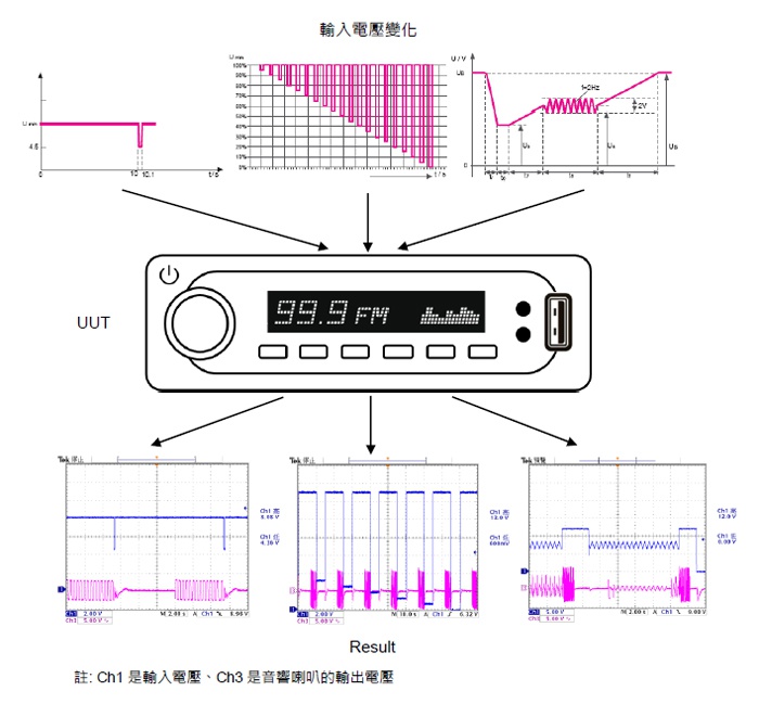 ▲Chroma 62000P進(jìn)行ISO 16750-2標(biāo)準(zhǔn)對車用音響進(jìn)行測試案例