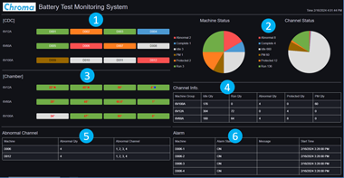 實驗室的電池測試系統會隨時回報各通道測試的狀態,透過17091 BTMS進行匯總并呈現在即時監控看板。 因此管理人員可以清楚的看到每個充放電系統與溫箱的使用現況、掌握設備與通道的使用狀態統計,當設備發生異常,看板可以迅速提示警示訊息,并發出聲音警示。