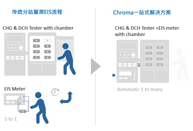 以往進行 EIS 量測時,電池需在直流充放電設備與交流阻抗分析儀之間反復上下架,常仰賴人工操作,不僅管理困難、耗費人力,過程也容易造成接點改變與溫度波動進而產生測試偏差,對低阻抗電池的量測結果影響尤為明顯,此外測試數據分散于不同設備與作業流程,增加整合與追蹤管理的困難。