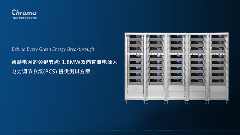 在能源多樣化與電網智慧化的推進下,PCS承擔的不只是電能轉換,更是整個智能電網穩定與效率的關鍵角色。Chroma 1.8MW雙向直流電源測試方案,將為您的下一代PCS提供全方位支持,從研發到生產、從模擬到實測,幫助您加速創新、縮短上市時間。