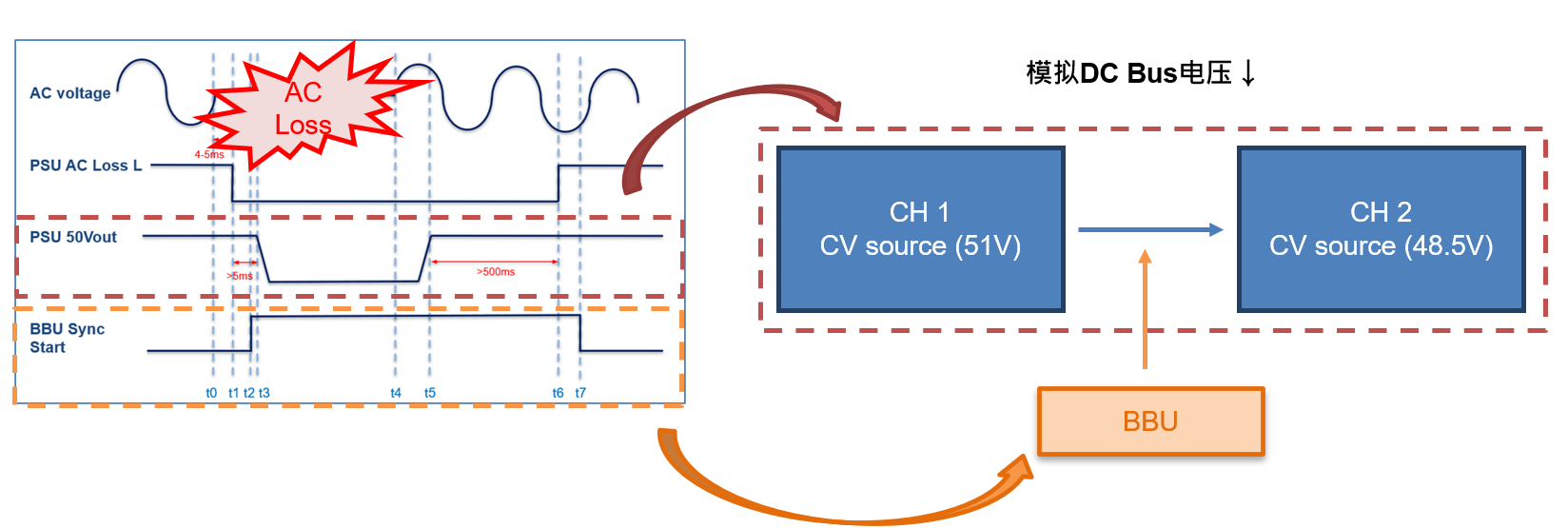 在環境模擬應用中,憑借內建的恒壓模式(CV Mode),系統可精準重現服務器機柜內DC Bus電壓動態變化。用戶可透過通道設定:一通道維持 51V恒壓電流源,另一通道仿真48.5V恒壓負載端,完整再現機柜斷電時的運行模式。當 AC 端斷電導致直流母線電壓由51V下滑至48.5V臨界值時,系統將自動觸發 BBU介入,并全程監控其響應速度與放電效能。此一完整解決方案,能真實還原數據中心應用場景,協助使用者提前驗證BBU的效能與可靠性。