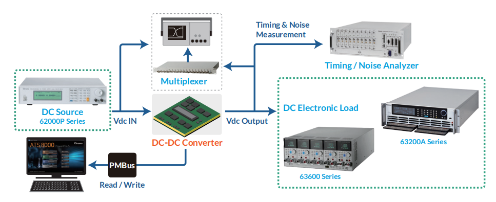 服務器內部的直流(DC-DC)轉換器能將輸入電壓范圍40V至60V轉換為12V,每個轉換器功率可達數千瓦,電流達上百安培。不僅需輸出穩定的電壓,轉換效率需達到98%以上。部分元件如內存、CPU處理器、集成電路(ASIC)等使用低于12V的電壓,同樣需要DC-DC轉換器進行調整。甚至AI服務器內部的GPU使用的Vcore電源模塊需將電壓降至1V以下,同時輸出電流需達到上千安培。Chroma的電源測試方案包含直流電源與高性能電子負載,可滿足各種直流需求。轉換器的規格。其高精度的測量功能滿足測試效率的要求。此外,還可靈活配置儀器組成Chroma 8000自動化測試系統,全面驗證直流轉換器的規格與性能,也可應用于生產線進行高效測試。
