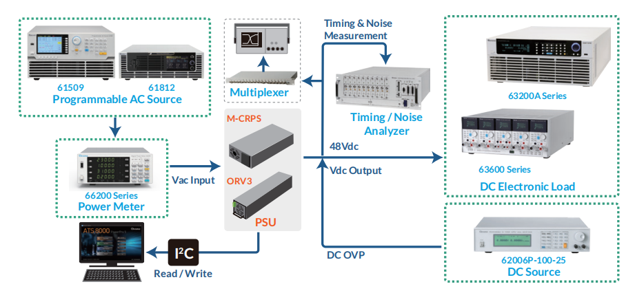 服務器的穩定運行仰賴高效能與高可靠度的電源供應器(PSU)。其核心功能是將來自電網的交流電(AC)轉換為服務器運作所需的24V/48V直流電(DC)。依據M-CRPS、OCP ORV3測試指南,Chroma直流電子負載63200A系列可滿足測試PSU規格與性能的要求。尤其針對測試PSU的瞬間功率及動態電流,電子負載63200A的高速動態特性更是適合。Chroma針對服務器電源PSU提供完整的測試方案,透過自動化測試流程與編程測試項目,驗證PSU在實際應用中的性能與可靠度,確保其滿足高標準的運行需求。相關測試設備與系統架構建議如下: