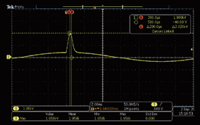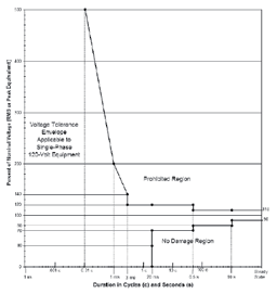 ITIC曲線描述了服務器電源在面對電壓異常(包括穩態和瞬時條件)時的耐受能力。大多數ITIC測試條件(如黃色和綠色區域的測試點)對于測試設備來說相對容易達成,然而,紅色區域中的500%電壓突波測試是極具挑戰性的。Chroma 61800-100實現了峰值電壓過1.9kV (277Vacx5 x1.414) 并維持了200微秒。
