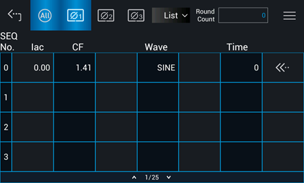 此功能可透過編輯最多100個序列(Sequence)來組合成連貫的拉載程序,每個序列可獨立進行拉載設定,包含了拉載波型的形狀。藉此,當使用者想復現出連續且不規則的電流波型(如電器的啟動電流),便可透過List Mode編輯數個序列,其中每個序列均使用UDW擷取真實的拉載電流波型,進而將現實中電器的整段瞬時拉載曲線完整復制,依此方式亦可完整發揮電子式交流負載優勢,將所有欲測試的拉載階段進行自由組合及排列,為V2L測試提供既簡單又完整的交流負載曲線仿真方案。