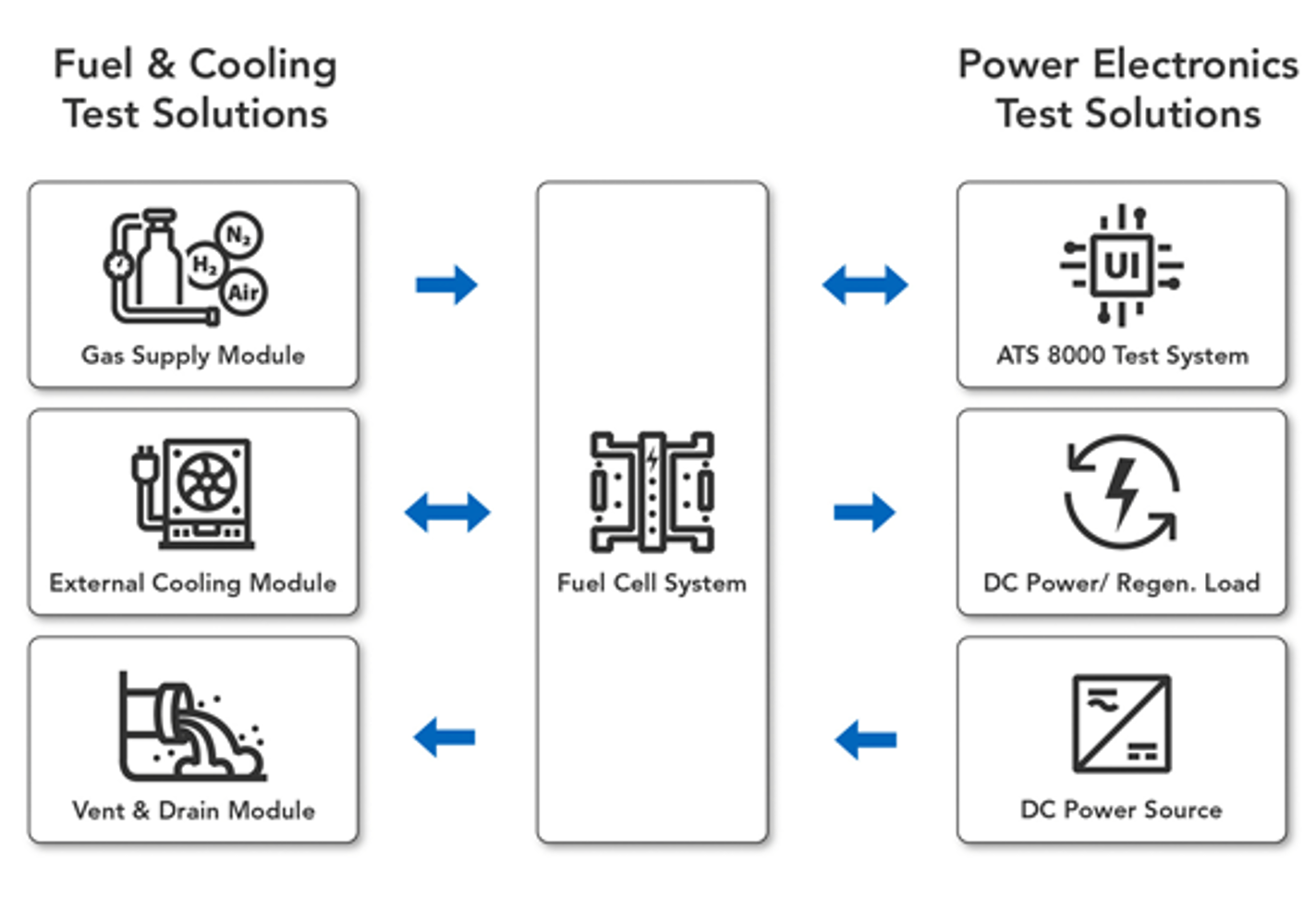 前者Chroma能提供燃料電池發動機所需的電源與負載,有多樣單機種類可供客戶選擇。如燃料電池堆負載所需的直流電子負載(DC Load)與系統周邊元件供電所需的直流電源供應器(DC Source)的設計配置;后者由Chroma與協力廠商合作開發燃料電池發動機用的水氣臺架(Gas-Cooling Test Bed),并以分成氣體供應模塊(Gas Supply Module)、尾氣排放模塊(Vent/Drain Module)和燃料電池堆散熱模塊(Cooling Supply Module for FC Stack)滿足燃料電池發動機外部的氣體監控與控制、氫氣空氣混合排放氣體處理與燃料電池堆內部散熱與溫度控制的標準化水氣測試需求外,可整合環境倉、BOP散熱模塊...等硬體功能達成客制化測試整合需求。