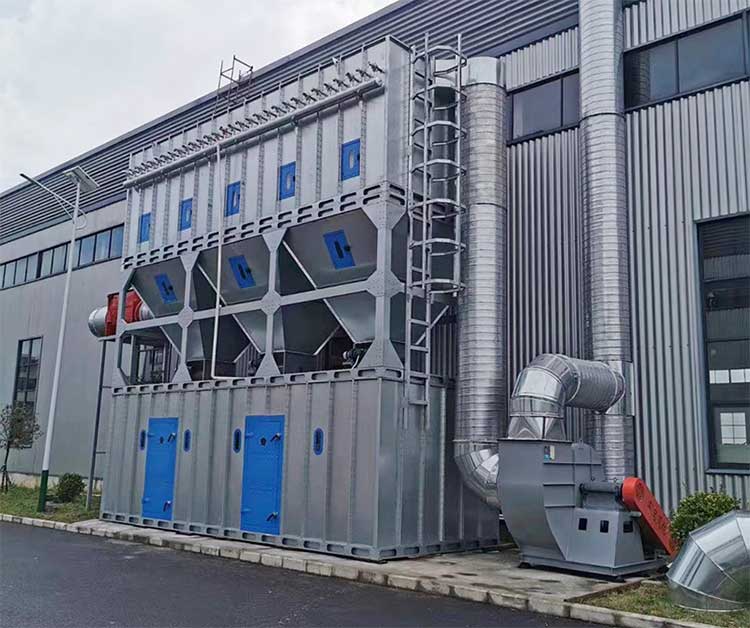 布袋除塵器主要由灰斗、過濾室、凈氣室、支架、提升閥、噴吹清灰裝置等部分組成。工作時,含塵氣體由風(fēng)道進(jìn)入灰斗。大顆粒的粉塵直接落入灰斗底部,較小的粉塵隨氣流轉(zhuǎn)折向上進(jìn)入過濾室,并被阻留在濾袋外表面,凈化了的煙氣進(jìn)入袋內(nèi),并經(jīng)袋口和凈氣室進(jìn)入出風(fēng)倒,由排風(fēng)口排出。隨著過濾的不斷進(jìn)行,濾袋外表面的粉塵不斷增加,設(shè)備阻力隨之上升。當(dāng)設(shè)備阻力上升到一定值時,應(yīng)進(jìn)行清灰操作,清除濾袋表面的積灰。