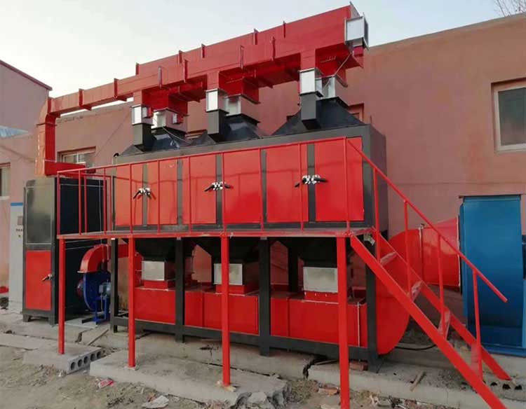 吸附時,廢氣在引風(fēng)機的作用下,截留的低溫低濃度廢氣進入凈化裝置進行吸收,廢氣被蜂窩活性炭吸附凈化,凈化后的空氣由風(fēng)機通過排氣管排出。