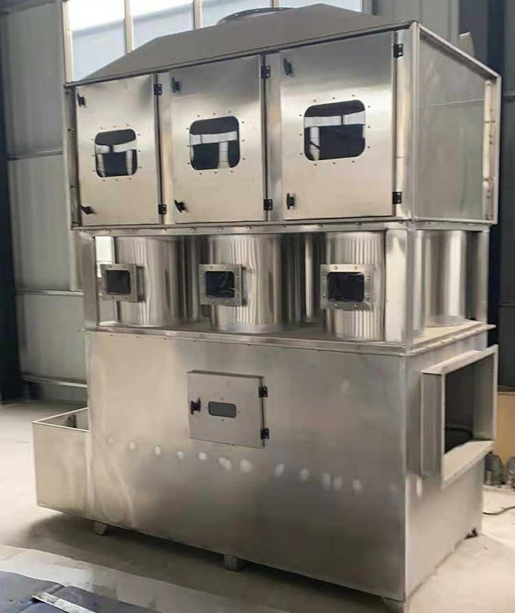 需要處理的含塵廢氣由風管引入凈化塔,經過旋流塔洗滌桶時,風帶加快,帶動填料球飛快運轉。在洗滌桶里,含塵廢氣與水霧充分混合洗滌,中和反應(水里補充有酸堿時)廢氣經過凈化后,再清除霧層脫水除霧后由風機排入大氣或再進入其他凈化設備(光氧催化、低溫等離子等)。吸收液在塔底輕水泵增壓后在箱頂噴淋霧化而下,***后回流直箱底循環使用,凈化的廢氣達到國家排放標準。
