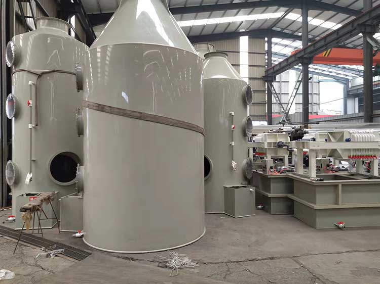 1.5萬(wàn)風(fēng)量pp噴淋塔塔規(guī)格為:ф1.8m*H4.0m*10mm。進(jìn)、出風(fēng)口直徑均為600mm。循環(huán)水量每小時(shí)22立方。每小時(shí)處理廢氣量15000立方左右。凈化塔整體厚度為8mm PP板。塔體內(nèi)部有二層水噴淋裝置,三層浮球填充,帶水箱和2.2KW純銅芯普通循環(huán)水泵。